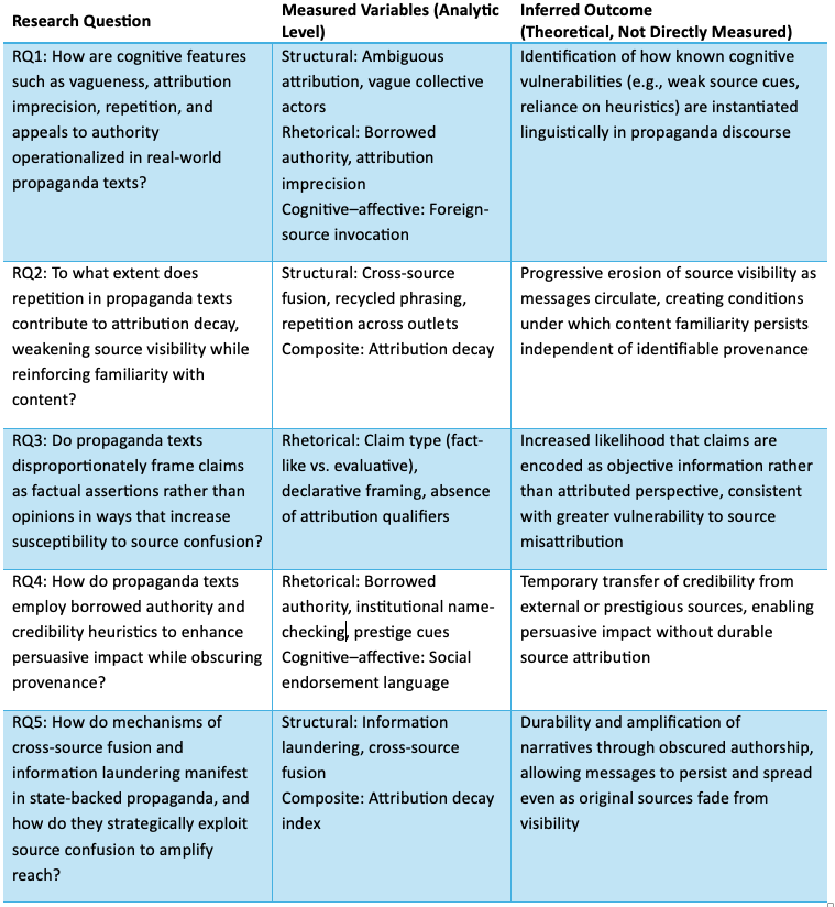 The preceding literature demonstrates that source confusion is not simply an individual cognitive error but a predictable outcome of repeated exposure, vague attribution, borrowed authority, emotional framing, and cross-platform circulation. Research in cognitive psychology shows that repetition and fluency strengthen memory for content while weakening memory for provenance, while scholarship on misinformation and propaganda documents how these vulnerabilities are strategically exploited through information laundering and narrative amplification. Despite these advances, prior work has rarely examined how such mechanisms are instantiated within authentic propaganda texts themselves, nor how specific rhetorical and structural features contribute to attribution decay in real-world media environments. Motivated by this gap, the present study examines how state-aligned propaganda texts are constructed to weaken the visibility of the source while sustaining persuasive impact. Rather than directly measuring audience cognition, the analysis focuses on textual indicators that prior research has shown to plausibly activate source-monitoring vulnerabilities. Accordingly, the study poses the following research questions as presented in Table 1 below.
